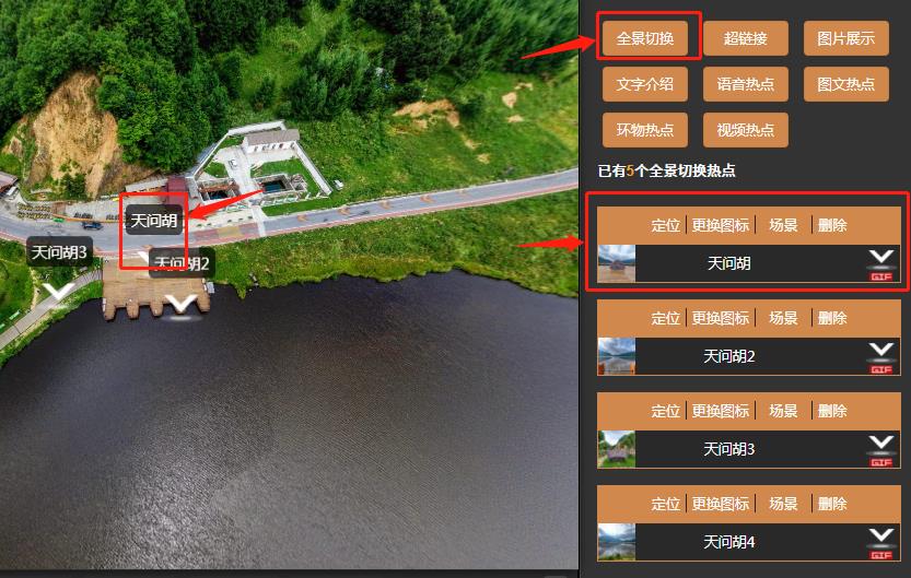 全景切換類型熱點:此類熱點用于切換到不同場景 ,同時可設置熱點的名稱。
