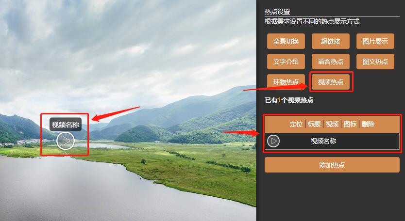 視頻熱點:點擊熱點,彈出視頻進行展示(視頻需先上傳至素材庫中,然后調用)。