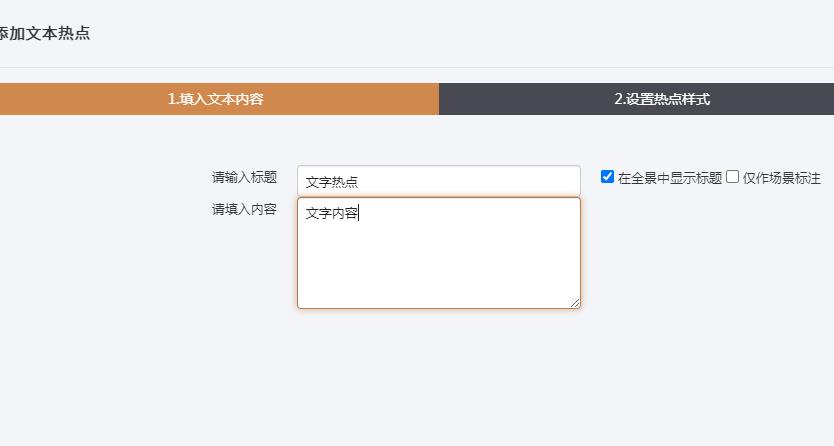 文本熱點:點擊熱點,彈出文本進行展示 。(若勾選“僅作場景標注”項,則該熱點只能在場景中顯示而無法點擊淡出)